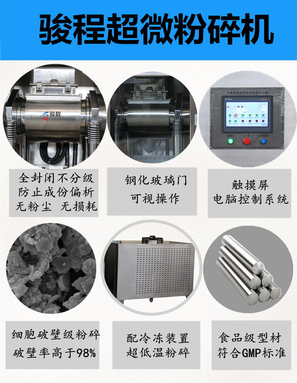 骏程振动研磨式超微粉碎机粉碎效率高,粉碎能力强,对于纤维状、高韧性、高强度、含油率高、含糖量高的物料都可以粉碎至细胞级微粉。全封闭不分级式粉碎,防止成份偏析及损失。粉碎机磨腔设有冷却闭路循环系统,配置制冷机,可以达到低温粉碎的效果。可粉碎在常温下难以粉碎的物料,可使升温后软化或发粘的药物易于粉碎,对含芳香性、挥发性成分的植物药材进行低温超微粉碎,可避免有效成分的损失。保证了物料的色泽、品质、成分。