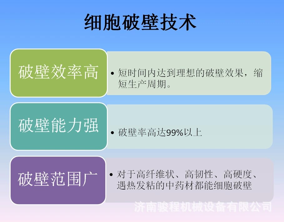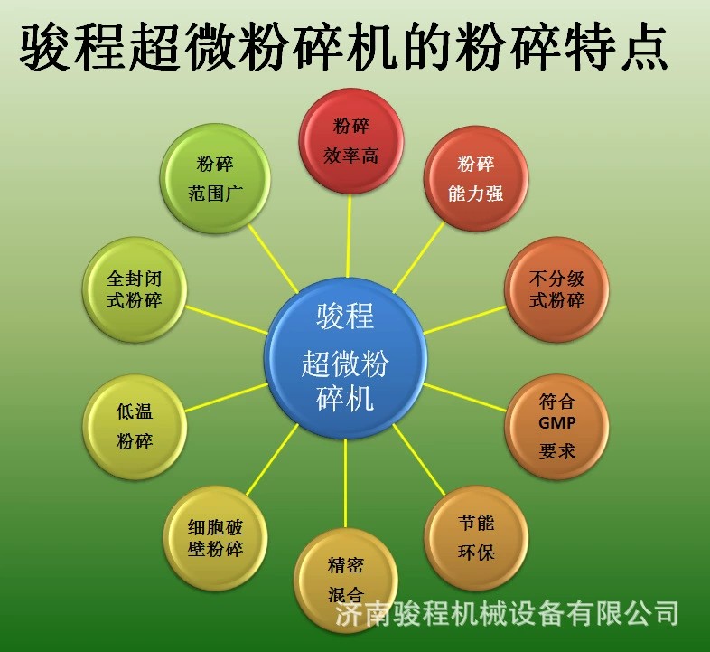 骏程虫草破壁超微粉碎机能使药材粒度达到细胞破碎级,使药物细胞间和细胞内有效成分直接释放出来,提高药物中有效成分的溶出速度和溶出率。采用全封闭多磨不筛技术粉碎,一次成粉,无余渣、无损耗。所得超微粉纯度高、防止成份偏析及损失。选用低温功能,粉碎设备能连续生产,保证了物料的色泽、品质、成分,可使升温后软化或发粘的药物易于粉碎。